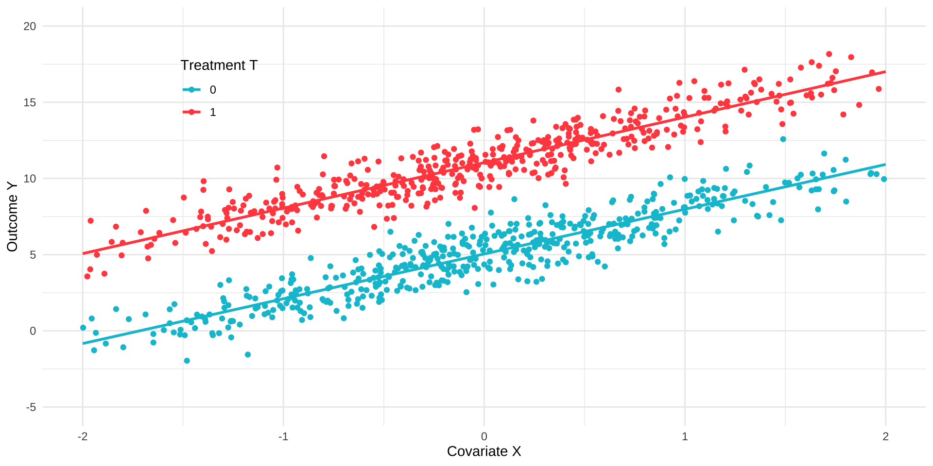 • \(\mathbb{E}[Y_i | T_i, \mathbf{X_i}] = \beta_0 + \beta_T T_i + \mathbf{\beta_{X}' X_i}\)
