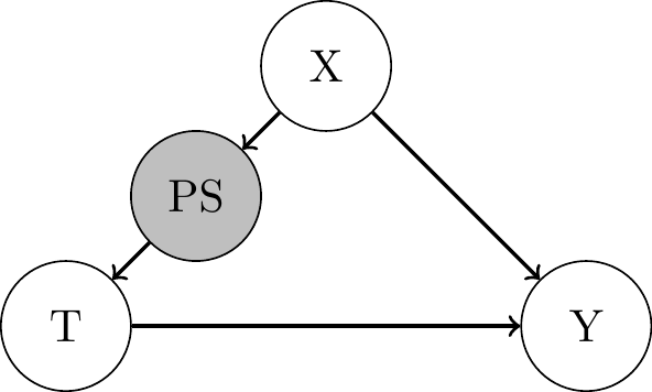 • \(\tau_{\text{ATE}} = \mathbb{E}\left[\frac{T_i Y_i}{PS(\mathbf{X_i})} - \frac{(1 - T_i) Y_i}{1 - PS(\mathbf{X_i})}\right]\)