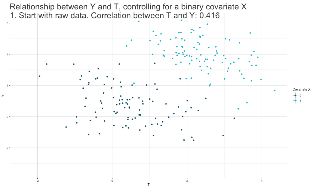 3. Run a residual-on-residual regression of the form \(\hat\epsilon_{Y_i \sim X_i} = \beta_T \hat\epsilon_{T_i \sim X_i} + \epsilon_i\) (no constant).